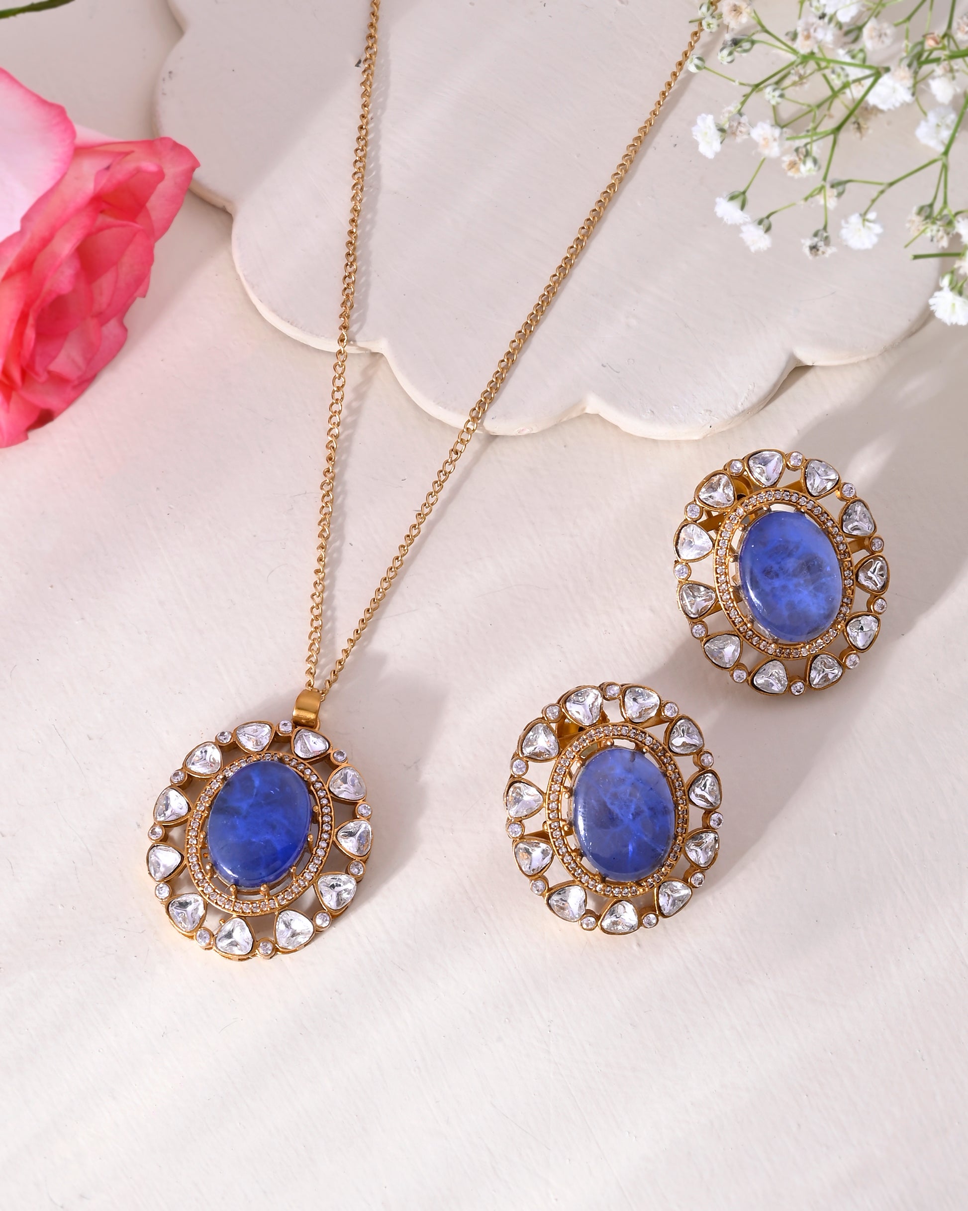 Doublets are semi precious rich natural gems like stones with gradients in it Discover the true essence of elegance with the Mumtaz Pedant doublet set. Featuring a hand-crafted gold plated doublet and stunning moissanite royal pendant, this set adds a touch of luxury to any outfit. Plus, with the rich natural gradients of the semi precious gems, this set is a true statement piece that will elevate your style.