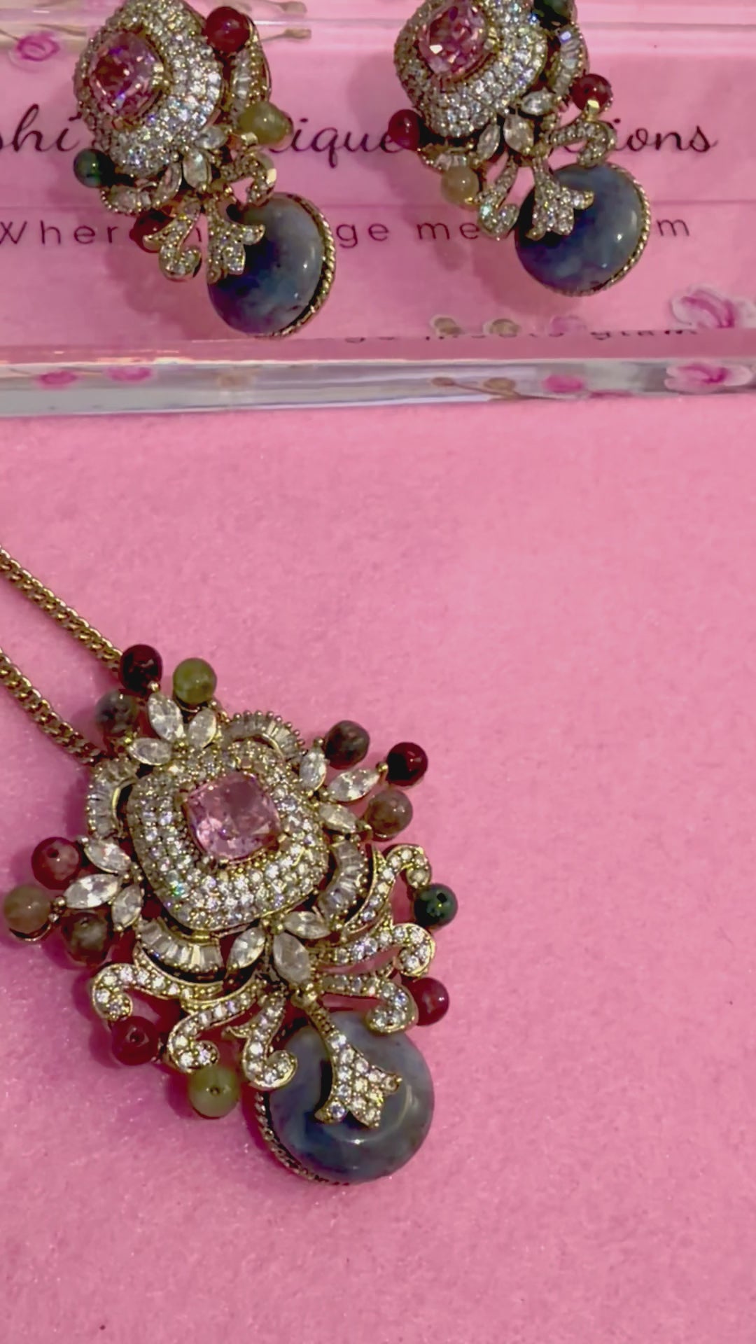 This stunning piece is studded with a beautiful onion pink semi-precious CZ, inspired by Swarovski. It’s embedded in champagne foil, giving it a more classy and vintage feel. The design is truly exceptional and will take you to new heights.